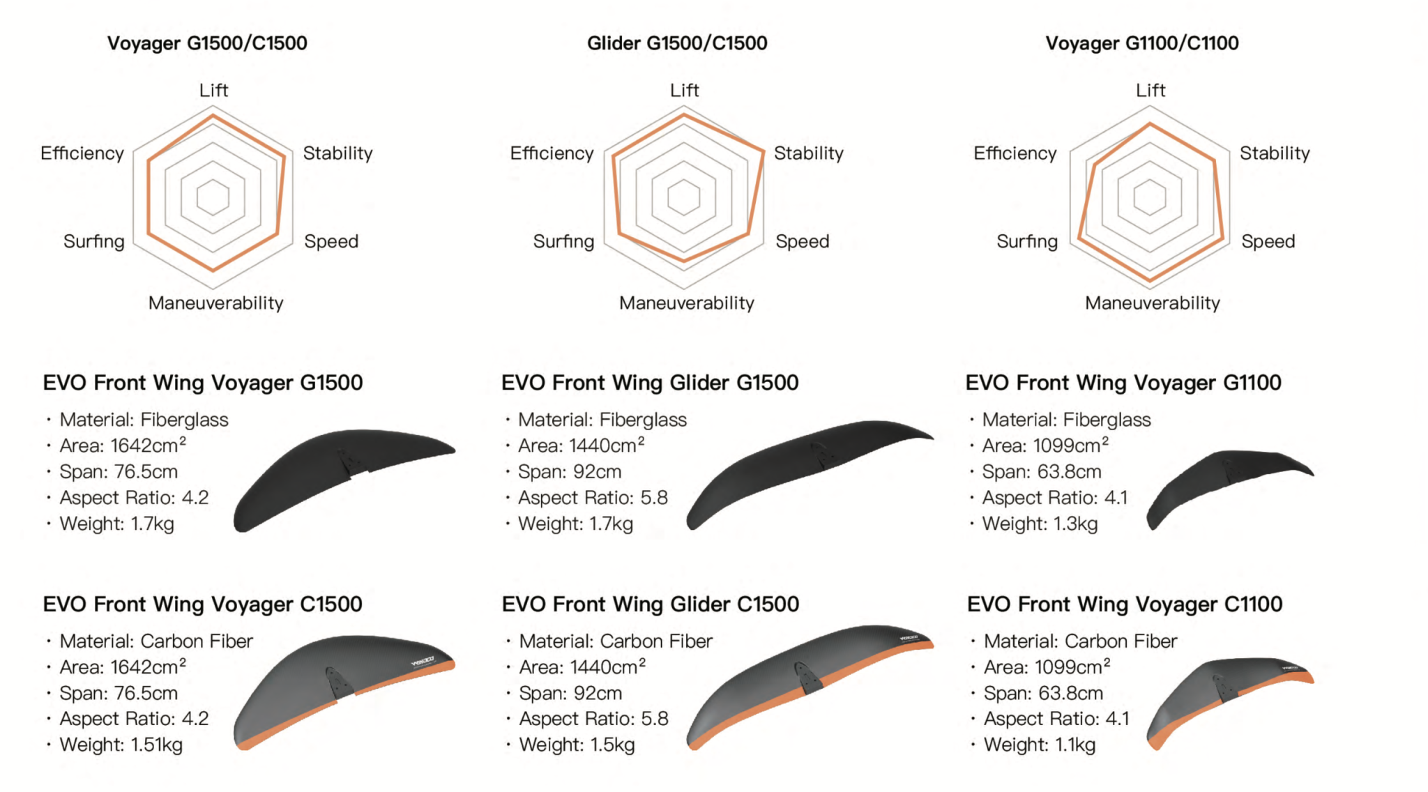 Glider G1500/C1500 Площадь близка к Voyager 1500, с меньшим сопротивлением для повышения эффективности полета. Тщательно продуманная диэдральная форма обеспечивает стабильность при прямом полете и лучшую управляемость на поворотах, что идеально подходит для дальних заплывов на eFoil.